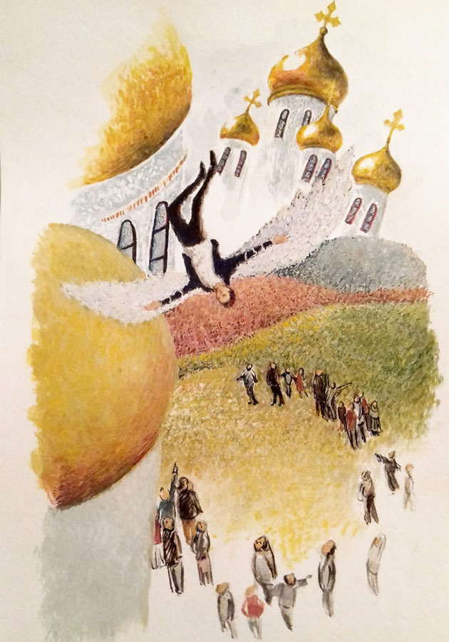 Ярко сверкают золотые купола с крестами, у подножья храма стоит толпа зевак, задрав головы, а мой персонаж с крыльями застыл нелепо в воздухе, пытаясь воспарить над земной суетой. Образ так сильно впечатлил меня, что я немедленно принялся набрасывать его эскиз карандашом. Учитель обходил класс и в порядке очереди заглянул в мой этюдник. Постоял минуту, держась правой рукой за подбородок, произнес «хм» и пошел дальше. Вскоре мой сюжет приобрел более ясные очертания, и учитель стал подолгу задерживаться возле меня со словами: «Интересно, интересно». А однажды, к концу урока, когда я принялся за краски, учитель дал мне пару советов. На мою работу стали посматривать ученики. В их глазах становился все заметнее живой интерес, а не вялое любопытство. И вот, наконец-то, последнее занятие. Мой герой полностью готов, только чуть-чуть поработать над фоном.