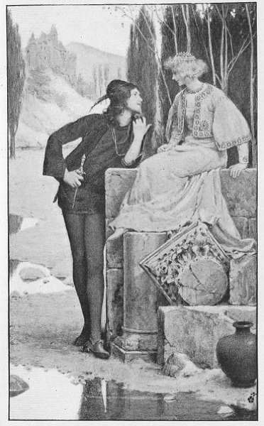 Затем Мерлин повернулся и при помощи волшебной палочки нарисовал круг, а потом вернулся и сел с принцессой у фонтана. В полдень она увидела, как из леса выходит множество дам, рыцарей и оруженосцев. Все они держались за руки и пели от сильной радости. Затем пришли танцующие люди с тимпанами и другими музыкальными инструментами. И никто не мог понять, что происходит. Затем по велению Мерлина вырос сад. Он цвел и давал плоды. Принцесса слушала их песню “Истинная любовь начинается весельем, а заканчивается горем” и ни о чем больше не думала. Праздник длился с обеда и до вечера. Король Дионас и его придворные пришли, чтобы посмотреть и недоумевали откуда взялись эти странные люди. Когда песни закончились, дамы сели на зеленую траву, усыпанную цветами, а оруженосцы затеяли игру, в которую играли до вечера. Тогда Мерлин подошел к девочке и спросил выполнил ли он все, что обещал.