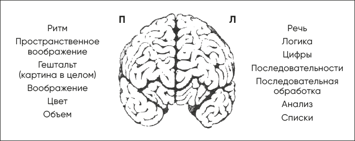 Говоря вкратце, Сперри и Орнстейн обнаружили, что каждая из двух половин, или полушарий, человеческого мозга, связанных между собой невероятно сложной сетью нервных волокон (так называемым мозолистым телом), отвечает за свои виды умственной деятельности. У большинства людей левое полушарие отвечает за логическое мышление, лингвистические способности, рассуждение, манипуляции с цифрами, последовательную обработку информации, аналитическое мышление и так далее – то есть за так называемые академические задачи. Пока левое полушарие занято своей работой, правое пребывает в «альфа-волне», то есть в состоянии наблюдения. Правое полушарие отвечает за ритм, образное мышление, воображение, цветовое восприятие, параллельную обработку данных, мечты, распознавание лиц и узнавание образов и схем.