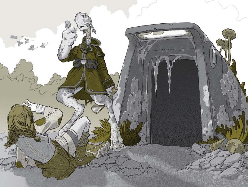 Зиа узнала жилистые ноги существа из старого Убежища. На голове у него красовалась широкополая шляпа, скрывающая лицо. Он нес на узких плечах увесистый и громоздкий рюкзак, и в такт его шагам дребезжали всевозможные вещицы, прикрепленные к рюкзаку снаружи. Существо остановилось, оперлось на вырезанный из дерева посох и фыркнуло, уставившись на девочку.