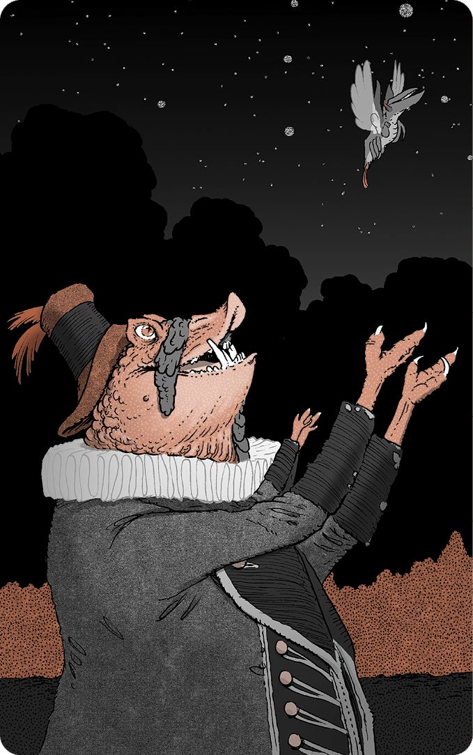 – Нет. Он ничего мне не сказал, – ответил Карункул и подбросил полено в огонь. – Но такие ружья, как у него, носят-имеют исключительно королевские гвардейцы Ее Величества. Для дорсеанца существует всего два способа заполучить-заиметь такое оружие: или он забирает его у павшего-мертвого гвардейца, или королева лично дает-вручает ему ружье.