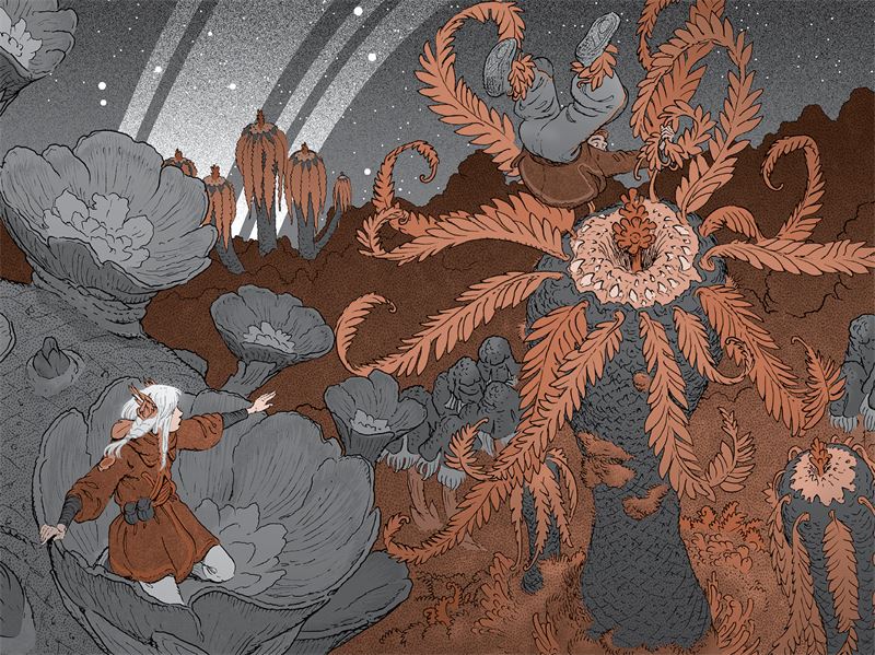 – Тсс! – Зиа сползла к нему и уцепилась за руку. Но опоздала. Хейли выдернули из укрытия и подвесили вверх ногами – какие-то покрытые листьями щупальца обмотали его щиколотки и крепко вцепились. Щупальца понесли мальчика к расположенной на высоком стволе розетке из крупных, как у пальмы, веток-листьев; в центре розетки красовался ярко-рыжий плод. Воющий птицелов.