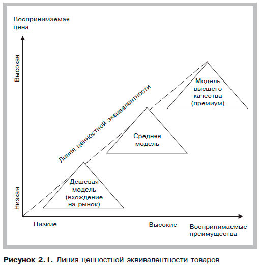 Потребители не всегда распределяются равномерно по линии ценностной эквивалентности товаров. На многих рынках можно заметить эффект «провала в средней части». Здесь одна часть покупателей стремятся приобрести продукцию с меньшими преимуществами, но по доступной цене, а другая, значительная по численности, группа отдает предпочтение высококачественной продукции с эксклюзивными ценами. Например, в гостиничном бизнесе высок спрос на четырехзвездочные отели с соответствующим уровнем услуг, а также на двухзвездочные отели эконом-класса. На отели среднего звена спрос относительно невелик. Более подробно вопрос о сегментации ценности мы рассмотрим в главе 4.