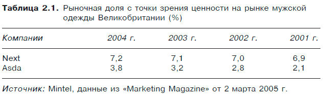 На рынках, где позиции конкурентов стабильны, соперничающие продукты распределяются по различным точкам указанной линии. Если конкурент отходит от линии, предлагая лучшее качество, можно ожидать увеличения притока потребителей к нему и роста его рыночной доли. Повышенная ценность возникает при появлении дополнительных преимуществ у товара или при уменьшении его цены. На рынке мужской одежды Великобритании компания Next предложила более высококачественные классические модели, и ее рыночная доля поднялась с 6,9 % в 2001 г. до 7,3 % в 2004 г. (см. табл. 2.1). Супермаркет Asda, запустив свой бренд «George» по относительно низкой цене, также расширил долю на рынке с 2,1 % в 2001 г. до 3,8 % в 2004 г.