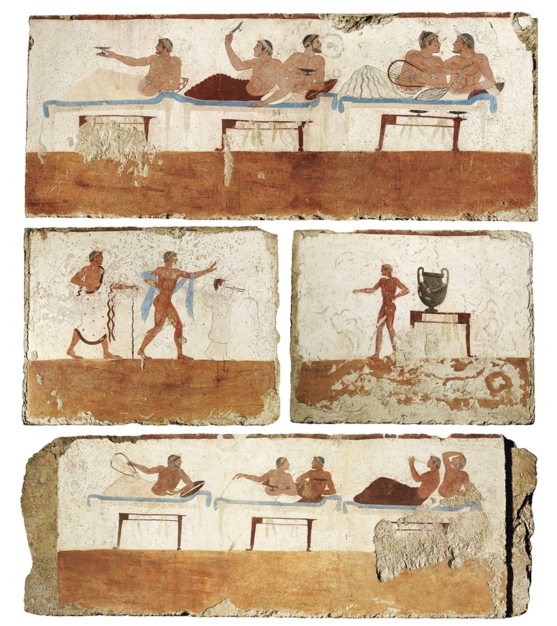 Но еще большей неожиданностью стало обнаружение гробницы, датируемой веком раньше, около 480 года до нашей эры. Росписи этой погребальной камеры были стилистически намного ближе к греческим образцам; их сюжеты также указывали на совершенно иной склад социальной жизни. Греческая Посейдония-Пестум снова одарила мир художественным шедевром, на этот раз особенно значимым для нас. Дело в том, что греческая живопись той эпохи, в Античности ценившаяся даже выше греческой скульптуры, которой привыкли восхищаться в Новое время, для нас безвозвратно утеряна. Настенные росписи гробниц до того момента были известны только из областей за пределами собственно греческой культуры – из Этрурии в Северной Италии и из Ликии на юге Малой Азии; соответственно, оставалось неясным, насколько по ним можно судить о «настоящей» греческой живописи. Теперь же перед нами предстал уникальный памятник живописи греческого запада времен его расцвета, засвидетельствованного знаменитыми храмами Пестума!