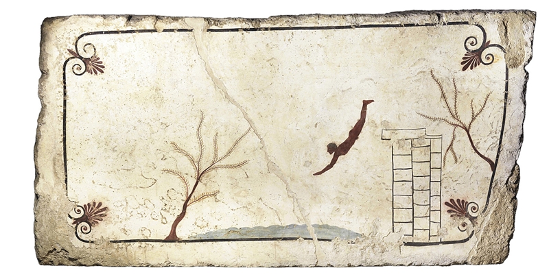 Изображение ныряльщика из гробницы в Пестуме (по-гречески город назывался Посейдония) – одно из тех редких произведений античного искусства, что сразу обращают на себя внимание и навсегда остаются в памяти у самых разных зрителей. Для любителей античного искусства теплые краски этого редкого памятника великой греческой живописи – живительный прорыв за пределы белоснежного мира мраморных статуй; а изящество и грация, с какими передан неожиданный мотив прыжка в воду, неодолимо притягательны сами по себе. Для ученого же это уникальное изображение – невероятный вызов: кажется, что, пока ты не понял эту картину, какая-то существенная часть античной культуры остается тебе недоступна.