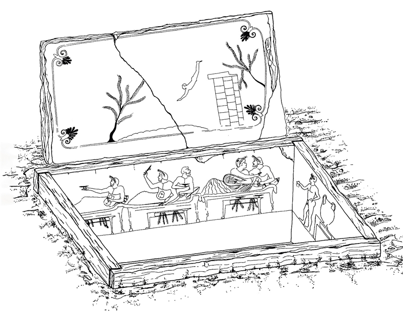 Итальянские археологи, раскапывавшие в 1960-х годах некрополи античного города Пестум (по-гречески Посейдония) под чутким руководством суперинтендента Марио Наполи, 3 июня 1968 года натолкнулись на гробницу, мгновенно ставшую главной достопримечательностью этого знаменитого исторического места (илл. 1–6). Камера площадью 1,93 × 0,96 м и высотой 0,79 м внутри оказалась украшена – по стенам и на потолке – уникальными росписями высочайшего художественного качества. Гробница была сложена из массивных известняковых плит; они были так аккуратно пригнаны друг к другу под тонким слоем штукатурки, что фрески внутри сохранили поразительную яркость красок.