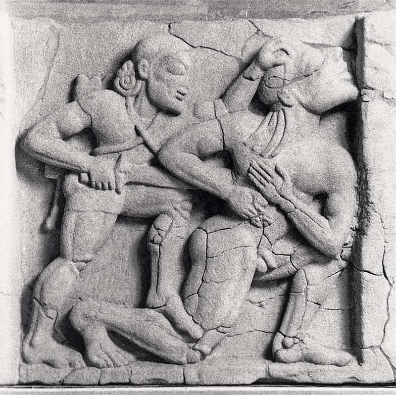 В ХХ веке новые открытия еще сильнее прославили Пестум как сокровищницу античного искусства. К северу от города, в устье реки Селе, археологи раскопали святилище богини Геры; судя по всему, здесь, за пределами города, собирались в основном молодые девушки для ритуалов инициации. От двух больших культовых сооружений VI века до нашей эры сохранились многочисленные метопы – квадратные плиты с рельефными изображениями. Одна серия метоп, грубоватого стиля, содержит намного больше сцен из греческих мифов, чем их сохранилось от любой другой античной постройки: здесь и подвиги Геракла (илл. 7), и Троянская война, и Аякс, в безумии бросающийся на собственный меч, и Сизиф, напрасно пытающийся вкатить камень на гору, – целая панорама героических деяний и судеб. Другая серия изображает девушек в богатых изысканных одеяниях, исполняющих соблазнительно-грациозный танец на празднике богини (илл. 8). Обе серии не имеют аналогов в греческом изобразительном искусстве.