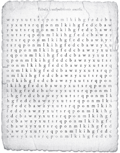 âItâs called a tabula recta,â said Lily. âItâs a âletter square,â created by a cryptological guy named Trithemius in the sixteenth century.â She flipped her phone around and widened an image with a swipe of her fingers. It was almost identical to the hand-inked square Becca had found in the diary.
