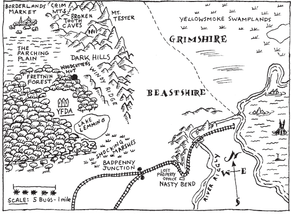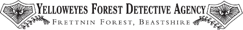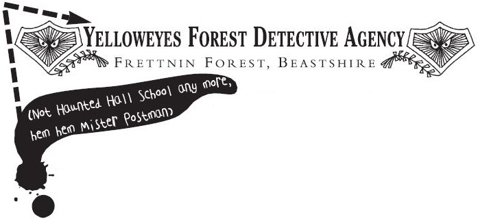 Please please please PLEEEZ don’t make me come home to Murkshire to live in the Lair with you and Smells. Whyo Y can’t I stay here in Frettnin Forest with Yeller, Stubbs and Normus? Because we like being detectives, it is good. Stubbs has made us posh badges with his clever beak like this saying YFDA (for Yelloweyes Forest Detective Agency, did you know that?).