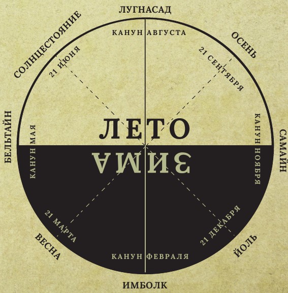 С течением времени эти незначительные ритуалы преобразованы в традиционные торжества символического характера и стали частью Колеса Года (современный языческий термин, обозначающий календарь праздников). Основное внимание в Колесе уделяется равноденствиям и центральным моментам между временами года. Каждому эти торжества дарят поддержку на пути к следующему сезону. Многие отнеслись к ним с непониманием. Есть люди, которые смеются над языческими традициями, но ты поймешь их значение, когда узнаешь откуда они к нам пришли. Представь наших предков в окружении беспробудной холодной зимы, сидящих у костра и мечтающих о солнечном тепле. Для них любая перспектива была поводом порадоваться, а надежда – способом выжить. Похоже, праздники для них значили больше, чем время похвастаться перед друзьями или побаловаться чем-то вкусным. Наоборот, на традиционных пиршествах люди лакомились дарами природы, пока они не успели испортиться.