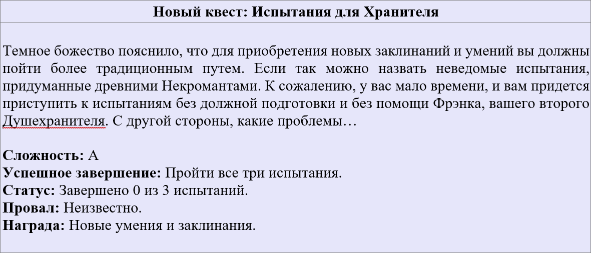 – В ходе испытания ты не сможешь призывать никаких созданий: у тебя отключено это умение. Ты не получишь никаких очков опыта за убитых здесь тварей. Это просто тренировка умений.