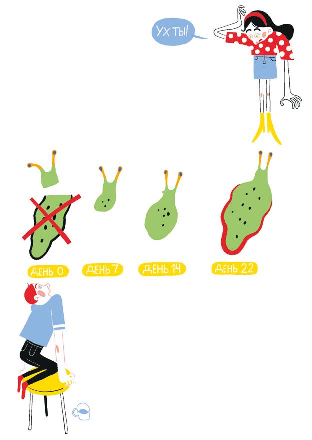 Когда это происходит, у слизня остается только голова – и больше ничего. Она тем не менее не погибает и даже может двигаться. Не умереть от голода голове помогают запасенные хлоропласты (части клеток, которые производят еду). Потом голова сама начинает питаться водорослями и постепенно отращивает новое сердце. Проходит 20 дней – и слизень как новенький!