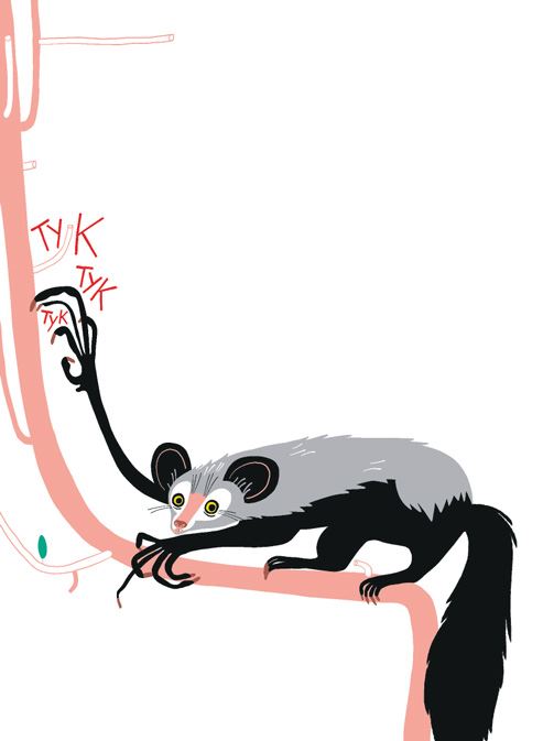 Самое необычное у руконожки – это пальцы на руках: средний чрезвычайно тонкий, а четвертый длиннее всех остальных. В поисках еды зверек простукивает своим тонким пальцем стволы деревьев, наклоняя вперед большие уши. По звуку айе-айе понимает, где именно под корой пустота. Потом руконожка прогрызает в стволе или ветке дыру и выковыривает оттуда жуков и личинок. Кстати, такими пальцами еще удобно выковыривать мякоть кокосов, личи и манго, да и просто чесаться приятно.