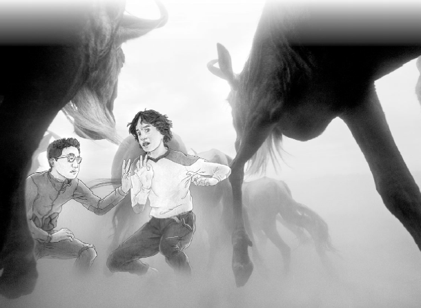Протерев глаза, Круз увидел, что Эмметт прав. Из вентиляционных решеток под ними вырывался коричневый дым. Придя в себя, Круз понял, что грохот раздавался из динамиков над их головами и что наводящий ужас бег стада – всего лишь трехмерное изображение, проецируемое прямо перед ними. Когда оно погасло и пыль осела, только Круз, Эмметт, Зэйн и Сэйлор все еще сидели на своих стульях. Остальные прижимались друг к другу, прятались под стульями или толпились у дверей. Дуган, который раньше сидел рядом с Крузом, теперь лежал плашмя на животе, изо всех сил ухватившись за ножки стула.