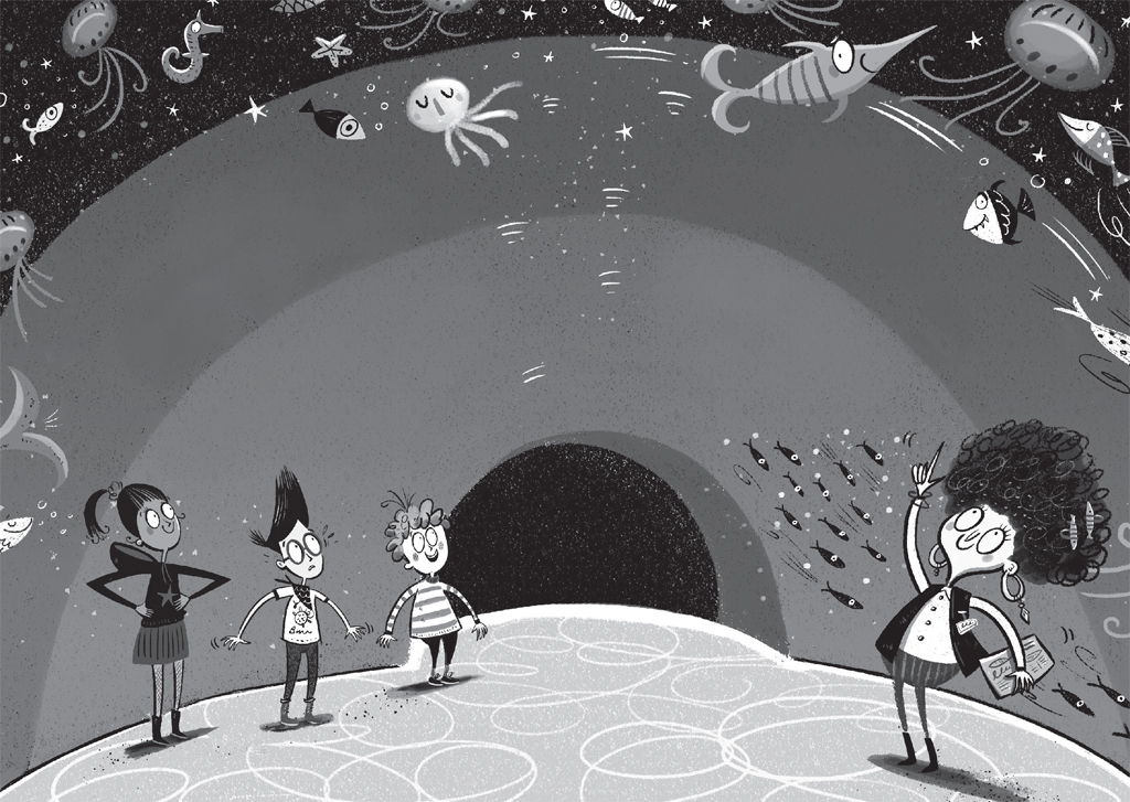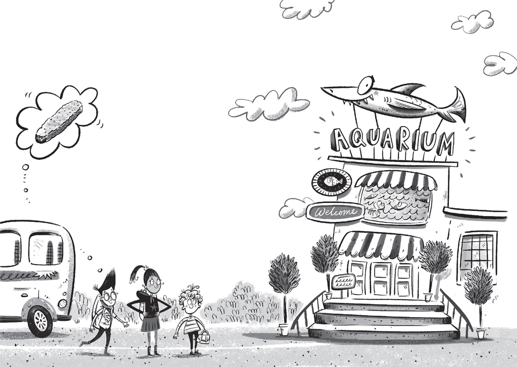 ‘Come along, you three, hurry up!’ It was our teacher, Ms Winkleworth. ‘We have lots to see – and we don’t want to be late for the feeding at the shark tank!’