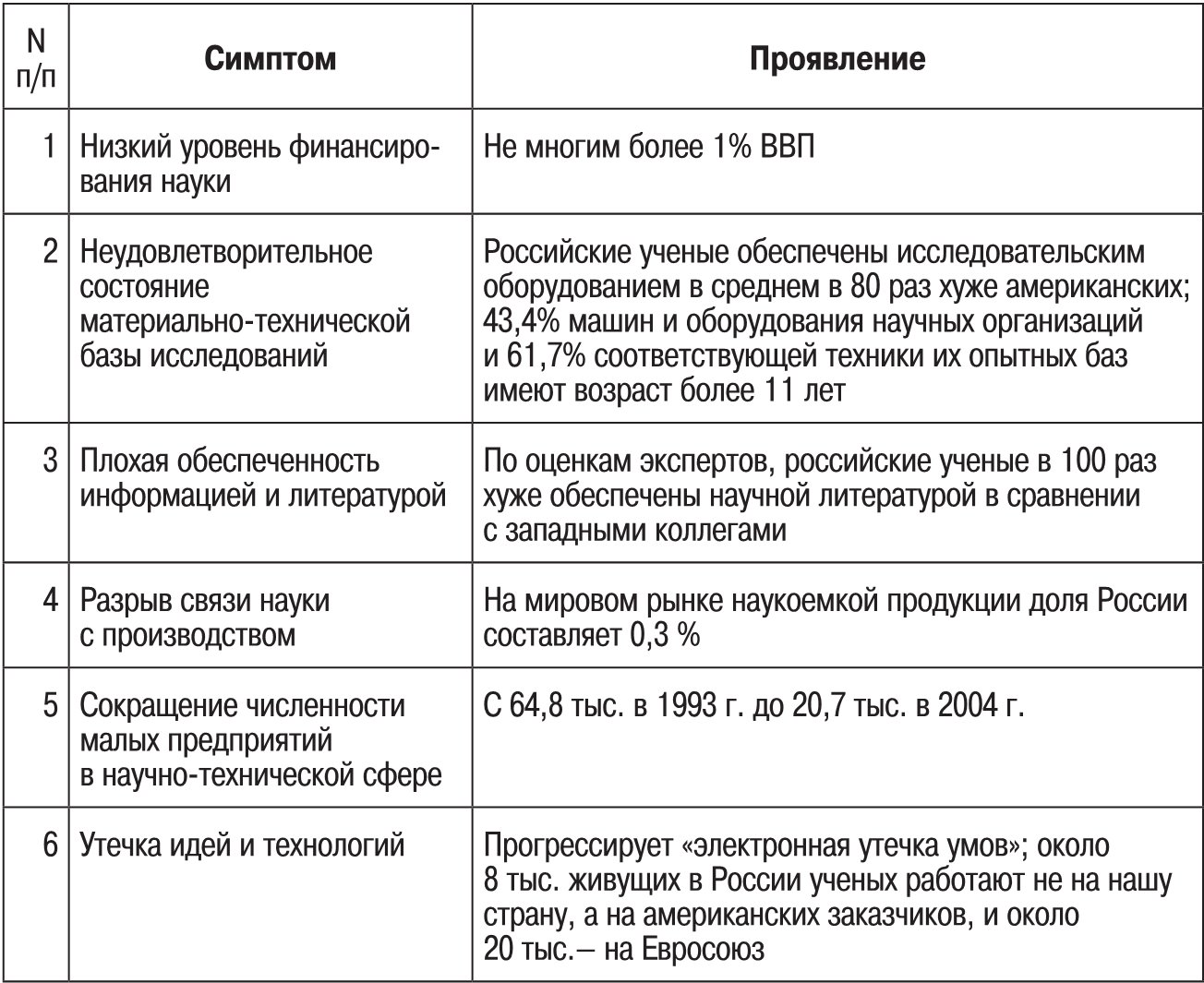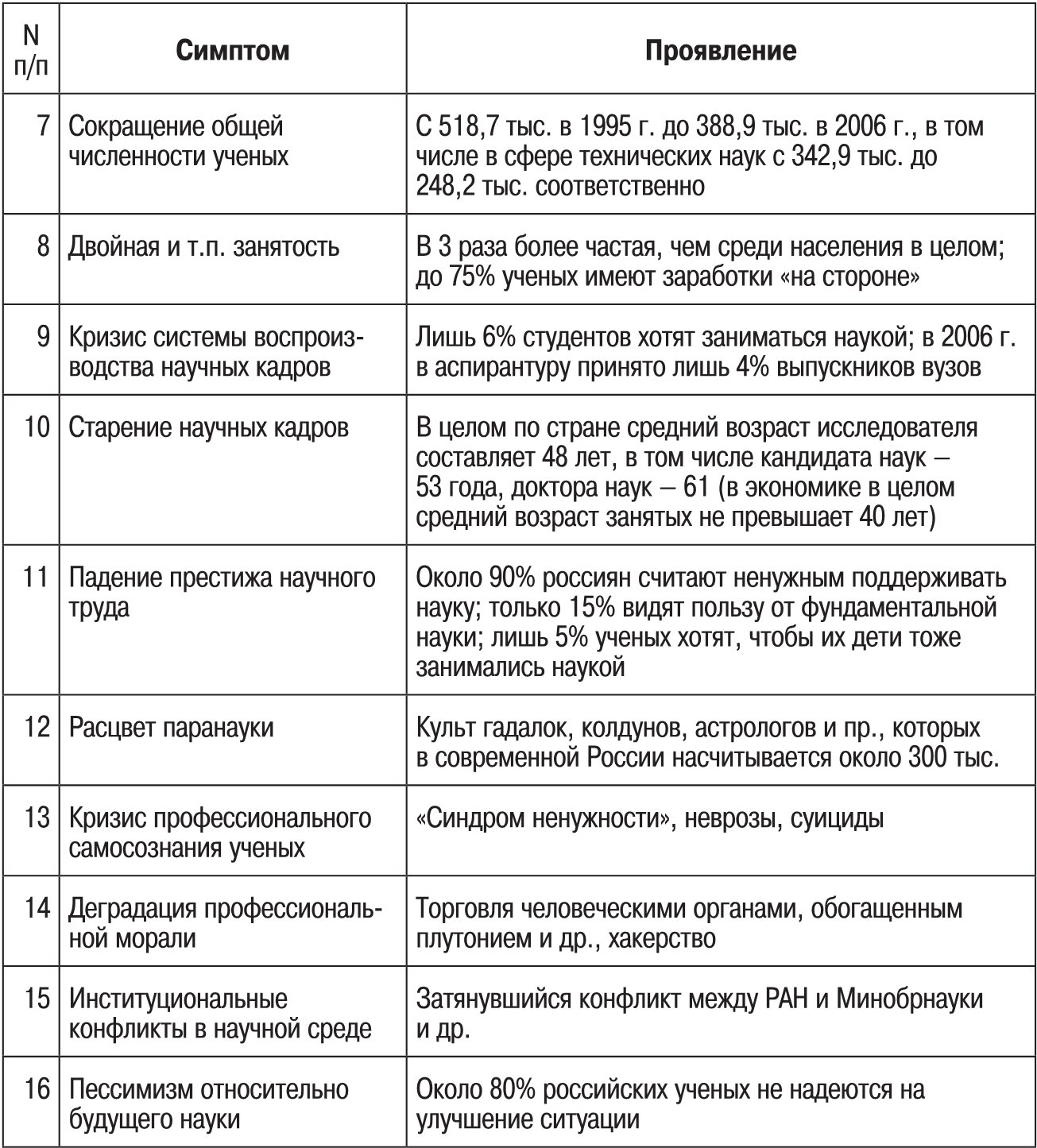 Характеристики современного состояния российской науки, как правило, даются в трагической тональности и сводятся к констатации ее глубокого кризиса. Разные авторы акцентируют внимание на различных симптомах этого кризиса, которые, тем не менее, можно объединить в целостную, представленную в таблице 1 картину.