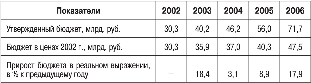 С 2002 г., когда были приняты «Основы политики Российской Федерации в области развития науки и технологий на период до 2010 года и дальнейшую перспективу», определяющие уровень ежегодного прироста бюджетных ассигнований на науку, в стране наблюдается рост бюджетных расходов на НИОКР, как в номинальном, так и реальном исчислении. Причем, как отмечается в исследовании Института экономики переходного периода, хотя темпы прироста бюджетных ассигнований на науку в реальном выражении были ниже, чем запланированные в «Основах…», однако они значительно превышали их показатели в странах с устойчивыми научными комплексами (таблица 3).