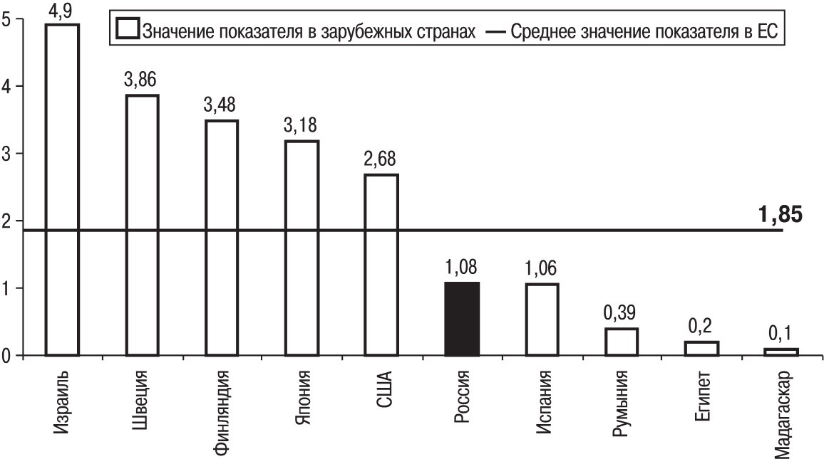 По показателю доли национальных расходов на НИОКР в ВВП, который в международной статистике также называется «интенсивностью НИОКР», Россия не только существенно уступает мировым лидерам в этой области, но и находится несколько ниже среднего уровня ЕС, где активно реализуется стратегия построения общества знаний и формирования единого европейского научного пространства, соответствуя лишь позициям отнюдь не самых продвинутых в сфере НИОКР стран, таких как Испания и Италия (рисунок 3).