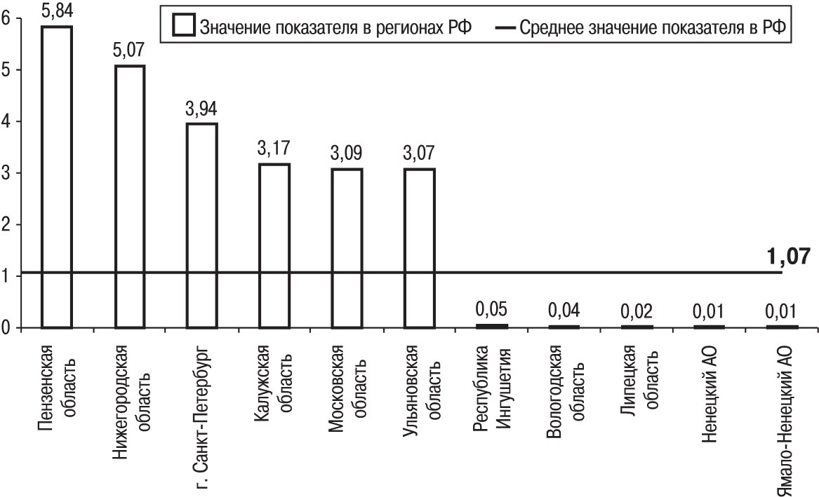 Вместе с тем на российском региональном пространстве выделяется целый ряд регионов, в частности Пензенская и Нижегородская области, а также Санкт‐Петербург, в которых данный показатель превышает максимальные мировые отметки. На другом полюсе инновационного развития находятся Ненецкий и Ямало‐Ненецкий АО, которые соответствуют лишь уровню менее развитых стран мира (рисунок 4).