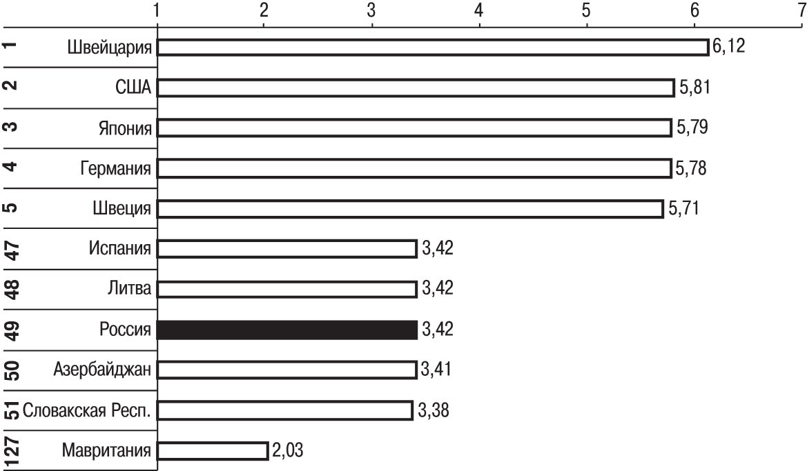 В этом отношении весьма показательны данные Доклада о глобальных информационных технологиях 2007–2008 (Global Information Technology Report, 2007–2008), подготовленного Всемирным экономическим форумом (ВЭФ) и международной школой бизнеса INSEAD, в котором объем внутрифирменных расходов на НИОКР в различных странах оценивается по 7‐балльной шкале: 1 баллу соответствует минимальное (худшее) значение показателя, 7 – максимальное (лучшее). По этому индикатору Россия занимает лишь 49‐е место в мировом рейтинге, включающем 127 государств (рисунок 5).