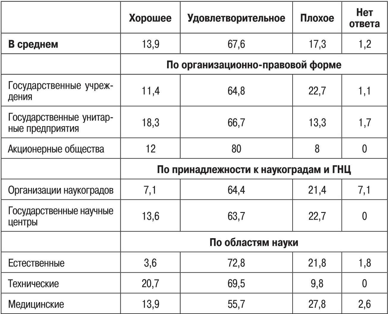 Хотя нынешнее финансовое положение российской науки уже далеко не критическое, как было в первой половине 90‐х годов прошлого века, проблемы подобного рода по‐прежнему сохраняются. Как свидетельствуют результаты обследования ЦИСН, проведенного в 2005 г., лишь 13,9% государственных (и полугосударственных) научных организаций оценивают свое финансовое положение как хорошее, причем доля таких организаций опускается до 3,6% в естественных науках и до 7,1% в наукоградах (таблица 5). Показательно также, что лишь в 37% обследованных организаций преобладают внебюджетные источники финансирования, свидетельствующие о возможностях данных организаций увеличивать свою ресурсную базу за счет коммерциализации результатов своей деятельности.