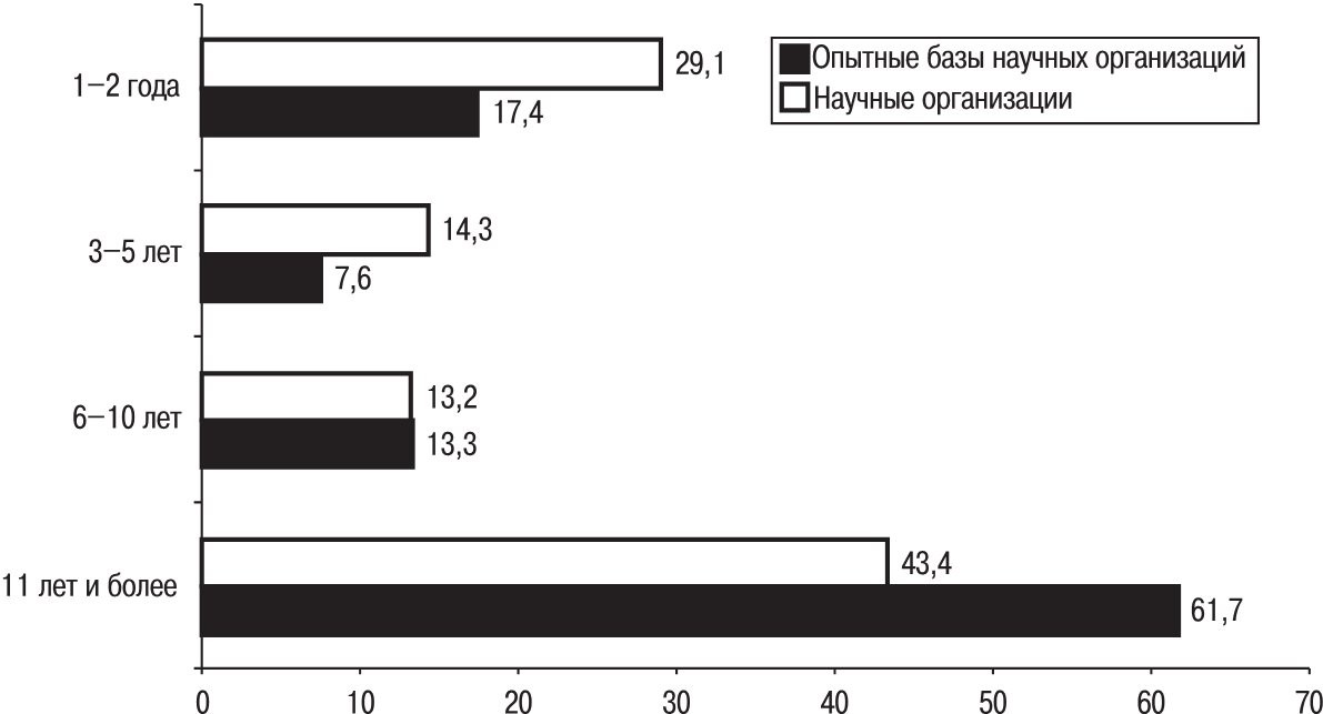 По данным ЦИСН, 43,4% машин и оборудования научных организаций и 61,7% соответствующей техники их опытных баз имеют возраст более 11 лет. Правда, в последние годы все настойчивее усиливается тенденция к обновлению парка научного оборудования, о чем свидетельствует довольно высокая (29%) доля новой техники, имеющей возраст 1–2 года (рисунок 6).