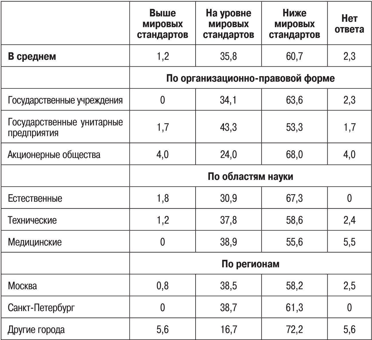 Гораздо лучше обеспеченность научных учреждений информационно‐коммуникационными ресурсами, хотя еще примерно половина организаций пока не дотягивает до мирового уровня в этой области. Как показывают данные ЦИСН, 49,1% научных организаций обеспечены этими ресурсами на уровне мировых стандартов, в том числе 63,6% государственных научных центров, 55% государственных унитарных предприятий, 54,6% институтов естественнонаучного профиля (Научные организации в условиях реформирования…, 2007).