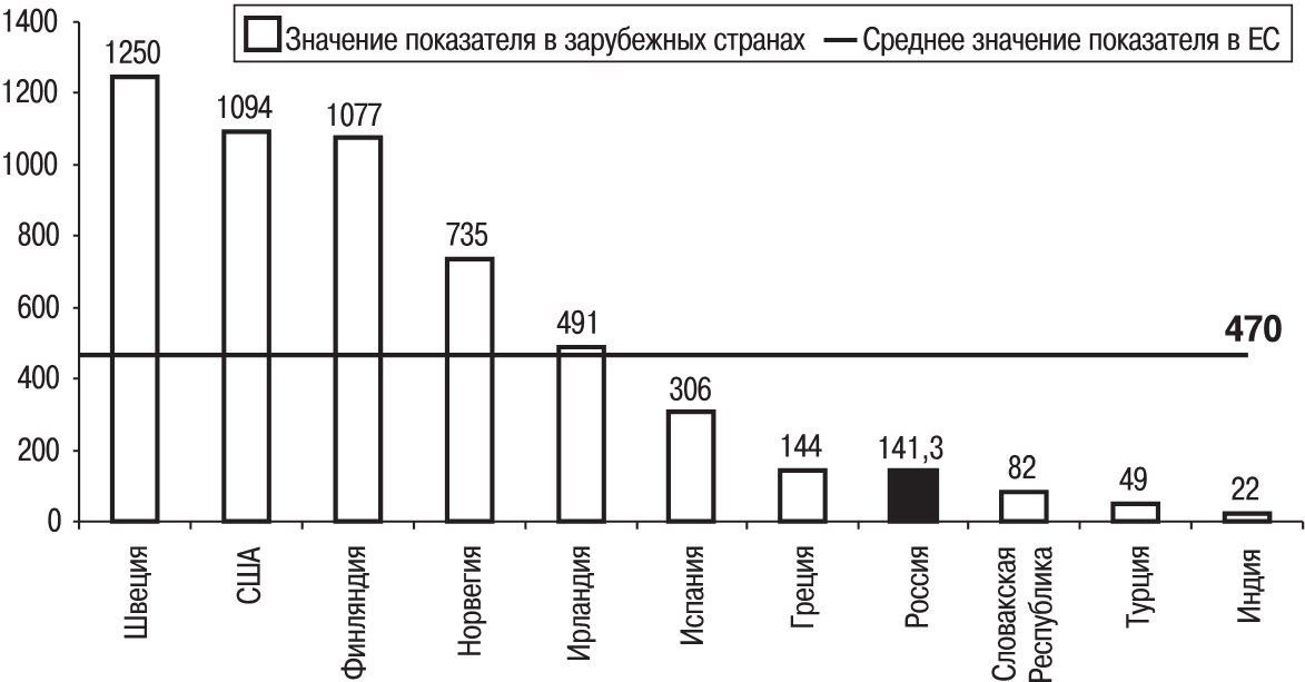 При межстрановых сопоставлениях становится очевидно, что в странах ОЭСР основные расходы в сфере НИОКР несет бизнес, удельный вес которого в структуре источников их финансирования превышает 60%, тогда как в регионах России на долю предпринимательского сектора и собственных средств научных организаций приходится менее 30% их объема. Поэтому Россия еще сильнее отстает от развитых и новых индустриальных стран по объему внутрифирменных расходов на НИОКР, которые, по данным Всемирного банка, составляют в России всего 0,3% от объема оборота предприятий, тогда как в странах с растущими экономиками – в Китае, Бразилии и Индии – находится в интервале 0,46–2,5% (Российская экономика в 2006 году, 2007, с. 572).