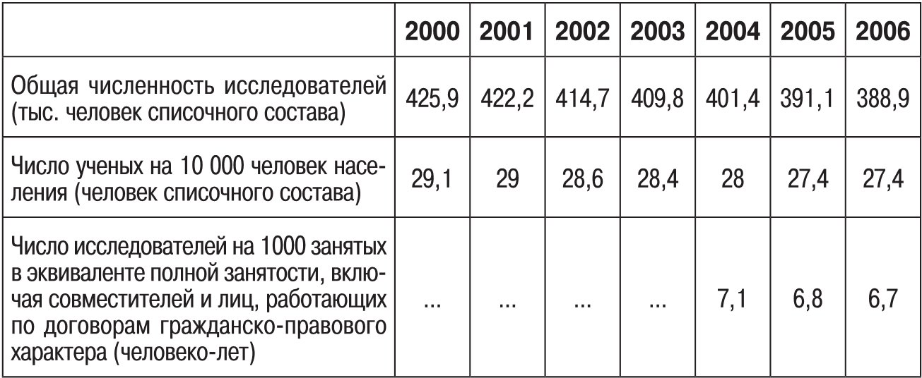 Согласно данным Росстата за 2006 г., 51% российских ученых старше 50 лет, в том числе 23% старше 60 лет, причем в московской науке эти показатели еще выше: 52% и 26% соответственно (Наука Москвы, 2004).