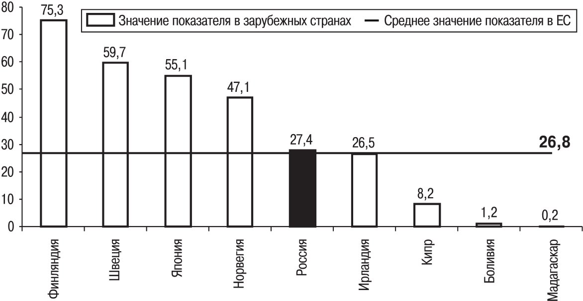 Указанная тенденция неизбежно ведет к ослаблению пока еще достойных позиций, занимаемых нашей страной по показателям численности ученых. По числу исследователей на 10000 человек населения (27,4) Россия пока опережает средний уровень ЕС, хотя и уже заметно отстает от целого ряда стран, в первую очередь от Финляндии, Швеции и Японии (рисунок 7).