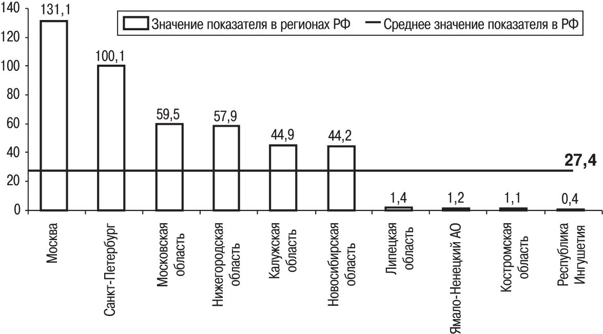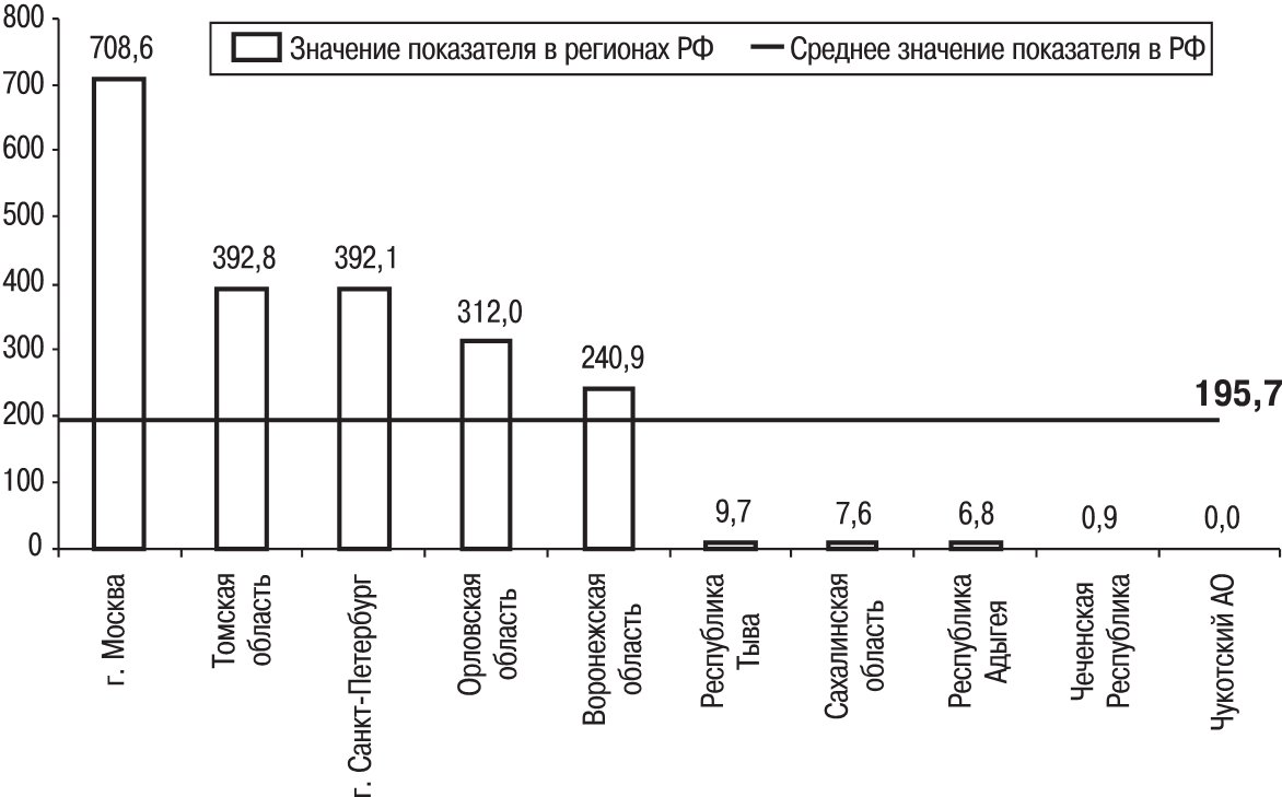 Российское научное пространство демонстрирует огромную гетерогенность в этой области. С одной стороны, по числу поданных заявок на изобретения на 1 млн. жителей российские регионы‐лидеры: Москва (708,6 заявок), Томская область, Санкт‐Петербург и Орловская область соответствуют уровню развитых стран с высокой изобретательской активностью. С другой стороны, Чукотский и Ненецкий АО и Республика Ингушетия, от которых совсем не подается заявок, а также Республики Чеченская и Адыгея, Сахалинская область, Республики Тыва и Алтай, проявляющие пассивность в области патентования (менее 10 заявок), соответствуют лишь уровню таких развивающихся стран, как Гватемала, Колумбия, Индия и Узбекистан (рисунок 11).