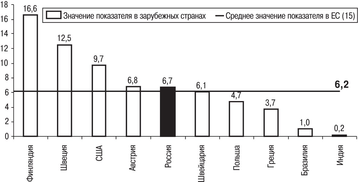 С учетом сокращения численности научного персонала число патентов на одного ученого увеличилось примерно в 3,5 раза. Однако в последние годы этот показатель в России обнаруживает лишь колебательную динамику без устойчивой тенденции к росту.
