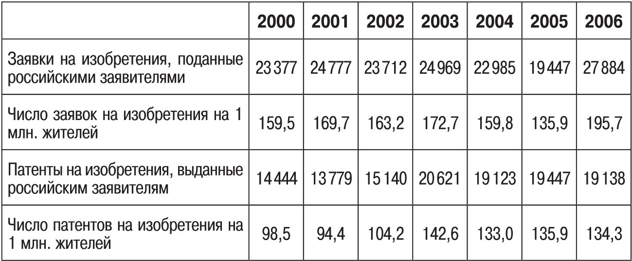Важным показателем продуктивности научного труда является также и изобретательская активность. По данным Федеральной службы по интеллектуальной собственности, патентам и товарным знакам (Роспатента) и Росстата, в последнее десятилетие возросло число патентов, выданных нашим гражданам в России как в абсолютном измерении: с 8938 в 1993 г. до 19 138 в 2006 г.,– так и в расчете на 1 млн. жителей (таблица 8).