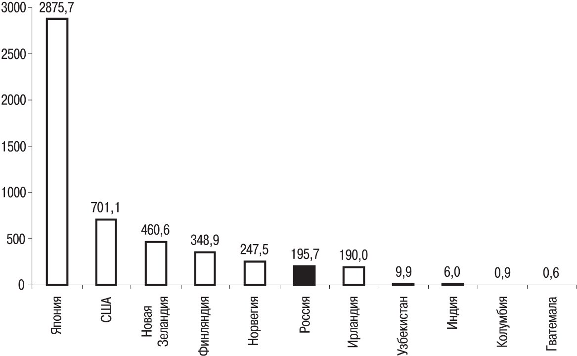 Рис. 10. Число поданных заявок на изобретения на 1 млн. человек населения в России, 2006 г., и зарубежных странах, 2005 г. (единиц)