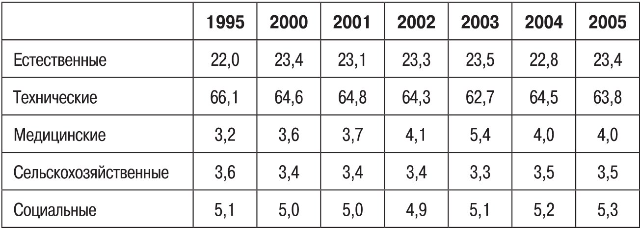 Е.В. Семенов констатирует, что российская наука отличается от североамериканской и западноевропейской меньшим удельным весом сектора социогуманитаных наук и существенно большим – инженерных наук. Он также отмечает, что дисциплинарная структура современной российской науки напоминает дисциплинарную структуру американской науки в 70–80‐е годы (Семенов, 2007).