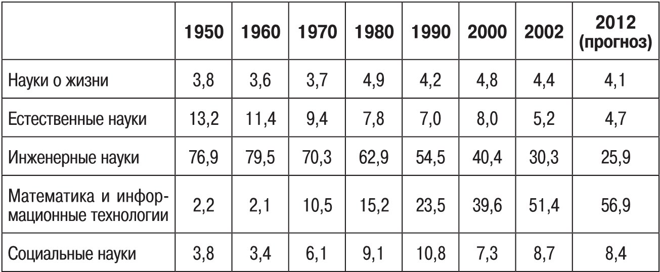 По прогнозам, подобные тенденции в занятости научно‐технических специалистов и спросе на них будут и впредь прогрессировать. В США к 2012 г. их число вырастет на 26%, тогда как занятых всеми остальными видами деятельности – всего на 15% (OECD Science, Technology and Industry Outlook, 2006, р. 92). Потребности в ученых экономики стран ЕС могут увеличиться к 2010 г. по сравнению с 2002 г. на 700 тыс. человек, что может еще более заострить проблему их нехватки в условиях наблюдающегося в целом ряде стран замедления роста и даже снижения численности выпускников вузов по естественнонаучным и инженерно‐техническим специальностям и старения научно‐преподавательских кадров2.