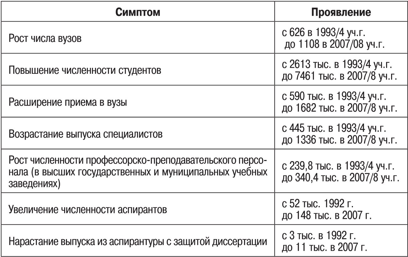 Востребованность образовательной функции науки сопряжена с тем, что начиная с середины 1990‐х годов отечественная система высшего образования по всем основным показателям переживает расцвет (таблица 13), что, кстати, служит очередным опровержением «экономического детерминизма», согласно которому массовая потребность в хорошем образовании возникает только на фоне развитой экономики.