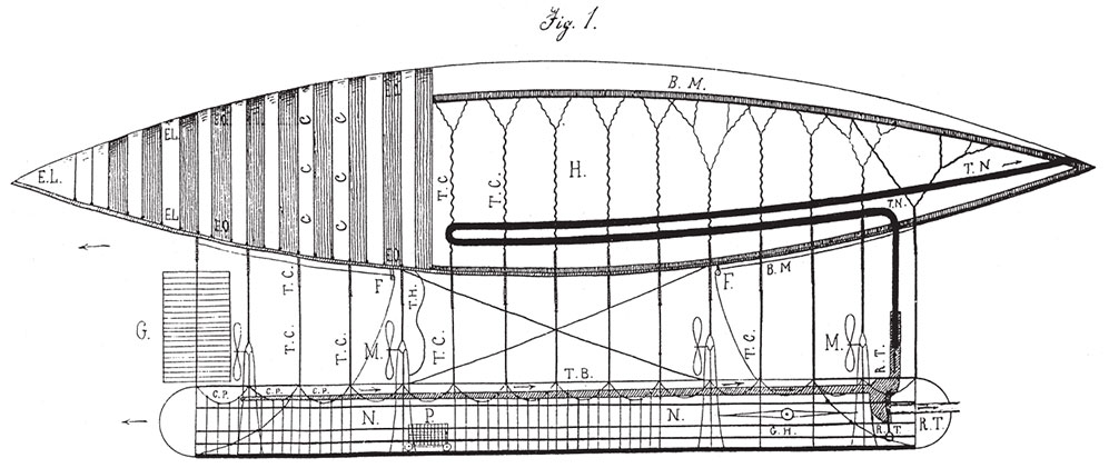 Если вы, читатель, решите то же уравнение, только более внимательно, чем г-н Поморцев, то получите Д = 47,3 метра, то есть чуть не вдвое менее. Также если вы при составлении самого уравнения в рассеянности, не перемешаете радиус с диаметром, как это сделал г-н автор, и напишите верно формулу площади круга, то самое уравнение изменится и, решая его, уже получим Д = 11,82 метра. Аэростат такой высоты (5,5 сажени) и объема (около 4000 кубических метров) не представляет никакой особенной трудности построения, потому что даже 24 года тому назад управляемый аэростат Дюпюи-де-Лома имел в высоту гораздо более (почти 15 метров). Итак, исходя из данных, приводимых г-ном автором, и избегая лишь некоторой его рассеянности, можно решить в положительном смысле вопрос об управляемости аэростата. (Ошибки эти указаны мною в «Техническом Сборнике», за 1896 год, № 2; адрес редакции: Москва, Долгоруковская ул., № 71)”.