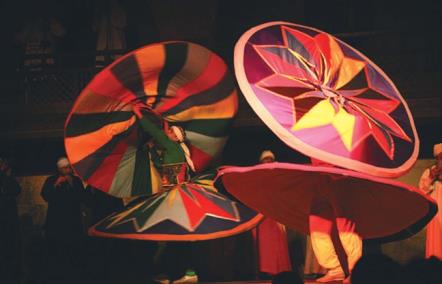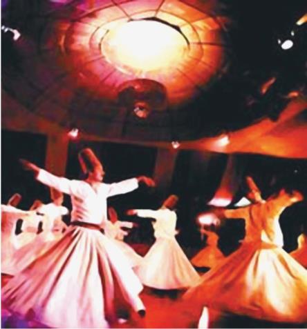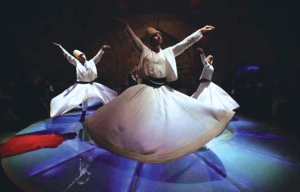 Суфизм – мистическая секта в исламском мире, представители которой положительно относятся к музыке и танцам. В дополнение к выражению любви к Аллаху в форме стихов это учение также допускает использование танцев и музыки в качестве средства поклонения. Все религиозные церемонии в основном сводятся к молитве о мире, здоровье и снисхождении Аллаха и обычно делятся на две части. Вначале все закрывают глаза и молятся молча, читая стихи молитвы. Затем подключаются барабаны. После музыкальной импровизации практикующие идут к главному учителю, чтобы выразить своё почтение, и лишь после получения его разрешения они могут начать танцевать. Перед танцем практикующие скрещивают руки и трижды обходят по кругу место представления, затем начинают вращения, повторяя «Аллах, Аллах», следуя ритму своего сердца. Когда музыка ускоряется, вращение тоже ускоряется, и танцоры открывают руки и вытягивают их. Ладонь правой руки обращена к небу, чтобы принять благодать, данную Богом, ладонь левой руки обращена к земле, чтобы передать благодать земле, при этом голова слегка наклонена вправо.