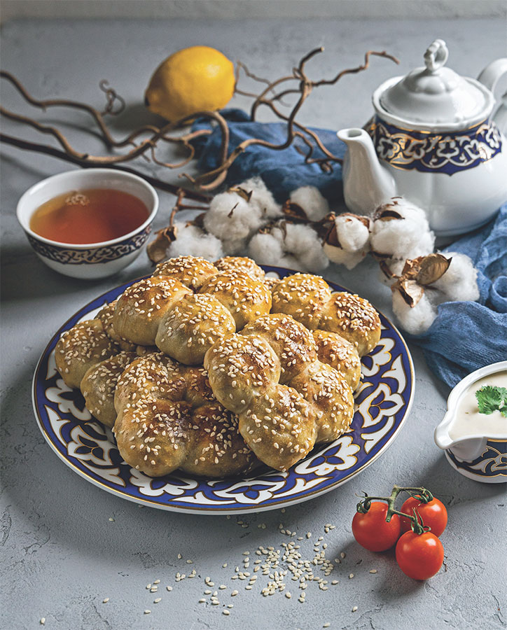 Отдохнувшее тесто делим на 48 примерно равных кусочков около 15 г каждый, скатываем в шарики и накрываем пищевой пленкой. Через 7–10 минут раскатываем по 4 шарика в небольшие кружки, в центр каждого выкладываем начинку и, присобирая тесто вокруг нее, плотно защипываем – получается четыре шарика с начинкой внутри. Выкладываем их по два близко-близко друг к дружке, в месте соприкосновения смазываем водой, чтобы «склеить» шарики между собой. Получается самса в виде коробочки хлопка – как по мне, выглядит очень эффектно и празднично. Формируем так все изделия, получается 12 штук. Выкладываем их на противень, выстеленный пергаментной бумагой, смазываем смесью желтка и молока, посыпаем кунжутом или седоной, можно и тем, и другим одновременно, выпекаем в заранее разогретой духовке при 200 °С около 25–30 минут. Готовую самсу подаем с пылу с жару и удивляем своих родных или гостей. Можете быть уверены, такое блюдо все оценят и по внешнему виду, и, конечно же, по вкусу!