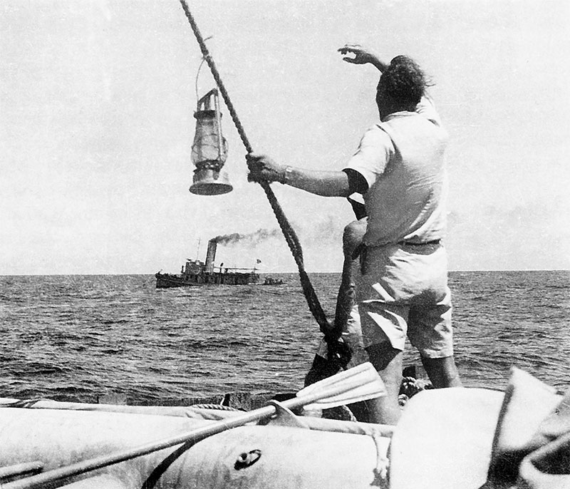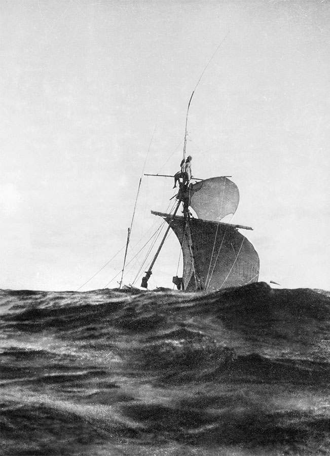 А вот о плотах они мало что знали. Плот – разве это судно: ни киля, ни поручней! Так просто – плавучее средство, на котором при аварии можно продержаться, пока тебя не подберут. Правда, один из них очень хорошо отзывался о плотах: он три недели провел на плоту после того, как немецкая торпеда пустила ко дну его судно посреди Атлантического океана.