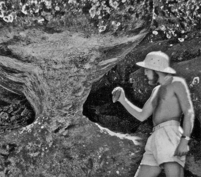 Скоро мы начали свозить на берег снаряжение. Поначалу вместе с двумя пасхальцами обследовали залив на алюминиевом плоту. Оказалось, что середина бухты свободна от подводных камней и прибой там несильный. Первым высадили кинооператора с его аппаратурой. Потом пошли обратно к катеру, стоявшему на полпути между берегом и судном. Вдруг мы увидели, как огромный вал вскинул катер на гребне. Его команда тотчас пустила мотор и взяла курс в море, спеша уйти от нового вала, который обещал вырасти еще больше предыдущего. Мы изо всех сил налегли на весла и благополучно перевалили через первую волну, но следом, круто вздымаясь вверх, катила вторая. Плот полез прямо на отвесную водяную стену и опрокинулся. Меня крепко стукнуло по голове, и я живо нырнул, пока понтоны не наподдали мне еще сильнее. Зажмурив глаза, чтобы их не засорило взмученной водой, я плыл вглубь, сколько хватило дыхания. Когда я, наконец, вынырнул, уже за перевернутым плотом, море опять выглядело нормально.