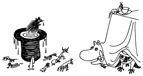 – Так вот откуда взялись тучки и глазастый долгопят, – сказала Муми-мама, когда они стояли на берегу, глядя вслед уплывающей шляпе.