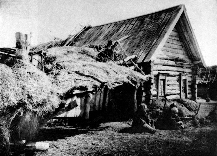Зримый образ голода в России. Уже съедена солома крыши дворов и сараев. Лошадки замерли в мертвенном покое…