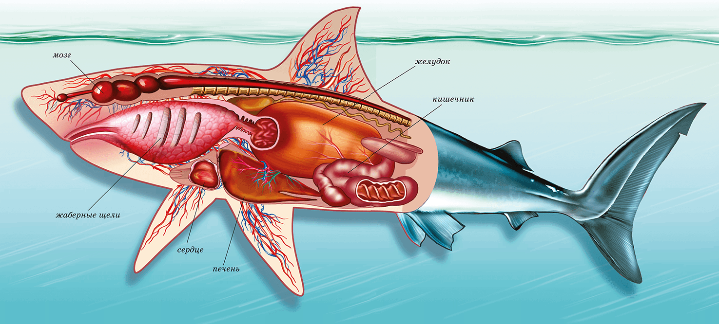 Акулы и скаты, как и многие другие водные животные, дышат жабрами. Только, в отличие от обычных рыб, у них не одно жаберное отверстие на каждой стороне головы, а 5 или 6. Они соединены с ротовой полостью. Вся система работает как насос. Вода попадает в ротовую полость через пасть акулы и выходит через жаберные отверстия наружу. Сами жабры хрящевых рыб действуют по тому же принципу, что и жабры других водных животных. Они представляют собой густую сетку кровеносных сосудов, покрытых тончайшей оболочкой. Через нее растворенный в воде кислород проникает прямо в кровь и разносится по всему организму. Кровь движется по сосудам благодаря работе сердца. Оно у хрящевых рыб устроено очень просто, гораздо проще, чем у людей, да и всех прочих позвоночных. Состоит всего из двух камер – одного желудочка и одного предсердия. Для сравнения напомним, что у людей сердце четырехкамерное. На голове у акул и скатов есть еще два небольших отверстия, которых нет у других рыб. Это брызгальца. Они соединены с ротовой полостью и тоже участвуют в процессе дыхания, особенно у скатов. Кроме того, через брызгальца иногда питаются еще не родившиеся детеныши.