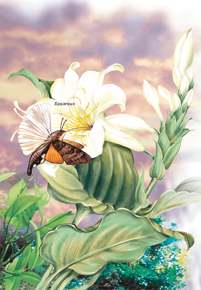 Ротовые органы бабочек преобразованы в длинный хоботок, который прекрасно служит для высасывания цветочного нектара. Когда бабочка не пользуется хоботком, она свертывает его в крутую спираль и прячет у себя под головой. В расправленном виде хоботок некоторых бабочек превышает длину тела. Бабочки-бражники, как птицы колибри, могут питаться нектаром в полете, засовывая хоботок внутрь цветка.
