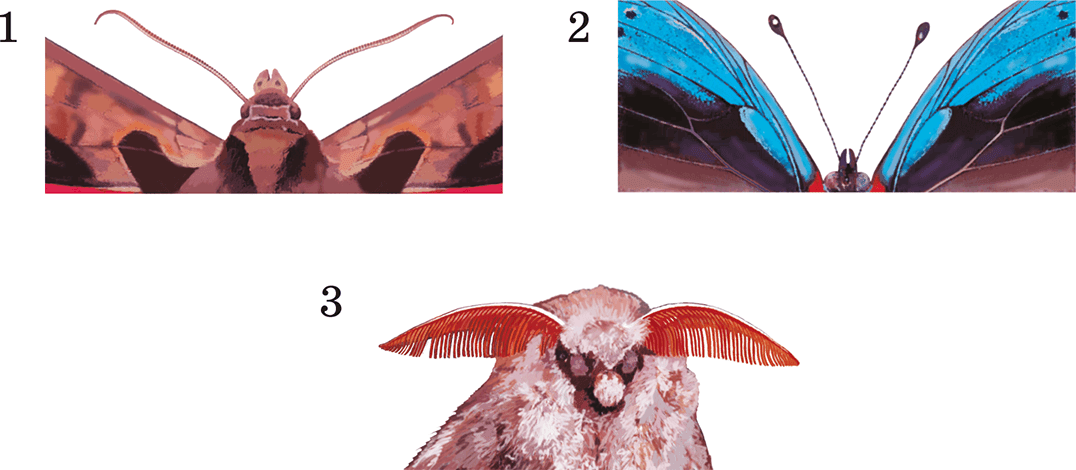 Различные формы усиков у бабочек: 1 – нитевидные, 2 – булавовидные, 3 – перистые