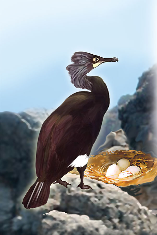 Стеллеров баклан был значительно крупнее обыкновенного баклана, с большими белыми пятнами у основания лап и желтыми ободками вокруг глаз, из-за которых его называли также очковым бакланом. Он умел прекрасно нырять и ловить под водой рыбу. Гнездился на высоких скалах, недоступных для наземных хищников, таких, как песцы. А вот летать стеллеров баклан не умел. До прихода людей на Командорские острова крупная птица прекрасно обходилась и без этого. Но когда появились охотники с ружьями, все изменилось. Бакланы были легкой добычей, их численность стала быстро сокращаться. В конце XVIII и начале XIX века такие явления еще совсем не волновали людей. Примерно через сто лет после открытия баклана Георгом Стеллером эта птица была полностью истреблена.