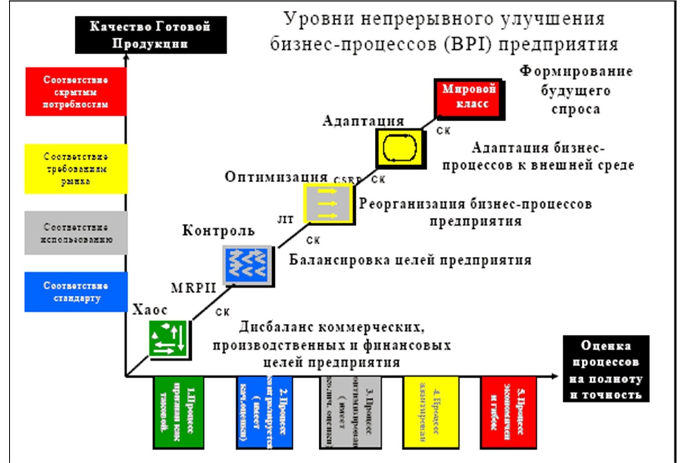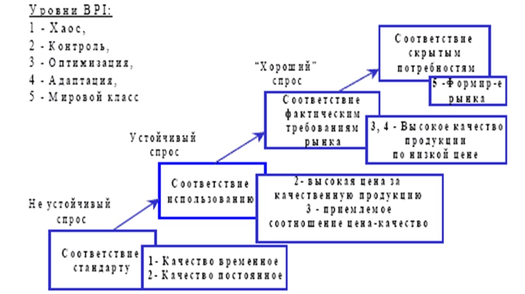 V. Мировой класс – возможность предприятия формировать рынок. Каждый BPI уровень можно охарактеризовать с точки зрения качества Готовой Продукции (ГП) и критериев управляемости процессов (то есть оценки бизнес – процессов на полноту и точность).